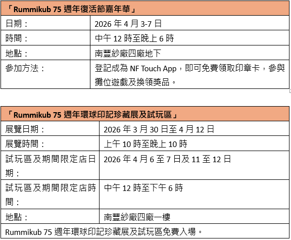 南豐紗廠「Rummikub 75週年期間限定店」限時登場!集合多款特色Rummikub牌組及周邊商品,讓玩家可以把經典遊戲帶回家。無論是收藏紀念、選購實用配件,還是為摯愛送上好禮,都能在這裡找到你的Rummikub心頭好。