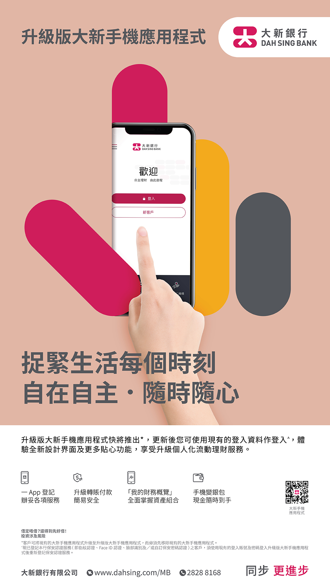 大新升級版手機應用程式提供更嶄新自主的銀行體驗,客戶足不出戶也可輕鬆理財。