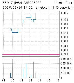 | 20367 | 阿里瑞銀六七沽A | 130.000 | 06/07/2026 | 0.050 | -0.012 | -19.355% | 5.31千萬 | 4.56百萬 | |
